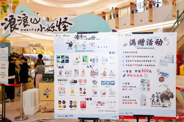 杭州大悦城《浪浪山小妖怪》电影主题快闪店内的衍生品介绍展牌